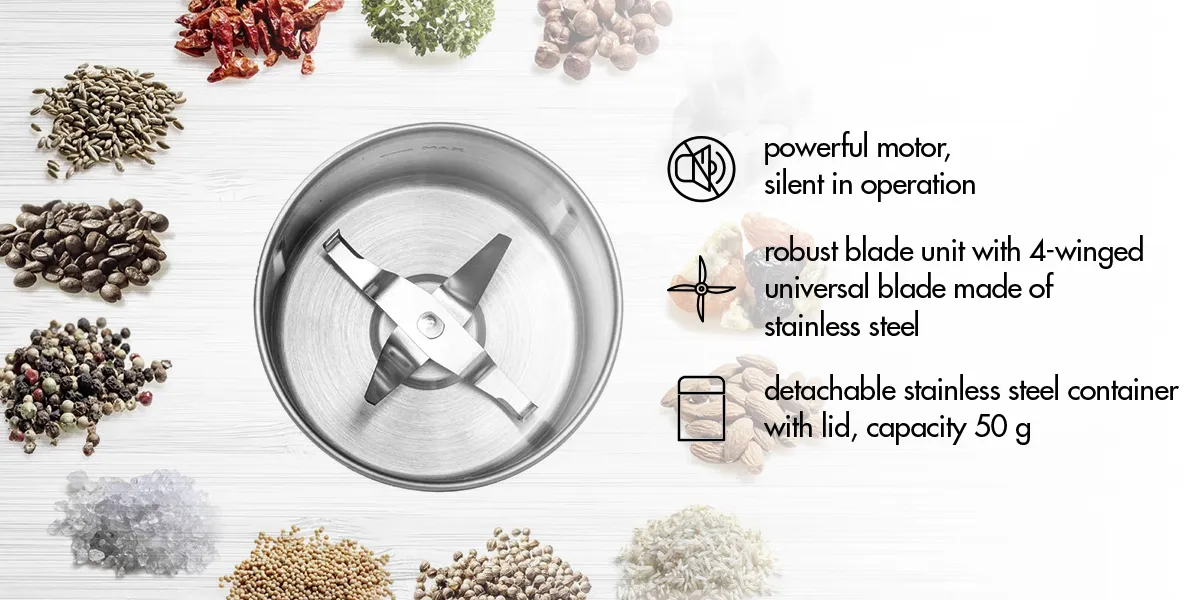 Q&A How to clean the appliance? – To prevent residues from drying on, always clean the appliance immediately after use. Clean the base unit with a damp cloth and dry it. Grinding / universal containers and lids can be cleaned in the dishwasher. My appliance won’t start anymore. What can I do? – Ensure that the cover is pressed down evenly. There are microswitches on the four lower corners of the cover that prevent the appliance from starting when the cover is incorrectly attached. – Another possibility could be overheating during usage. Make sure the grinder has cooled down before trying to start again. Which food can be ground in the appliance? – Coffee beans, dried and fresh herbs, dry spices, nuts without shell and seeds, etc. can be chopped up within the quantities usually needed for domestic use. Performs well for semi to wet ingredients.